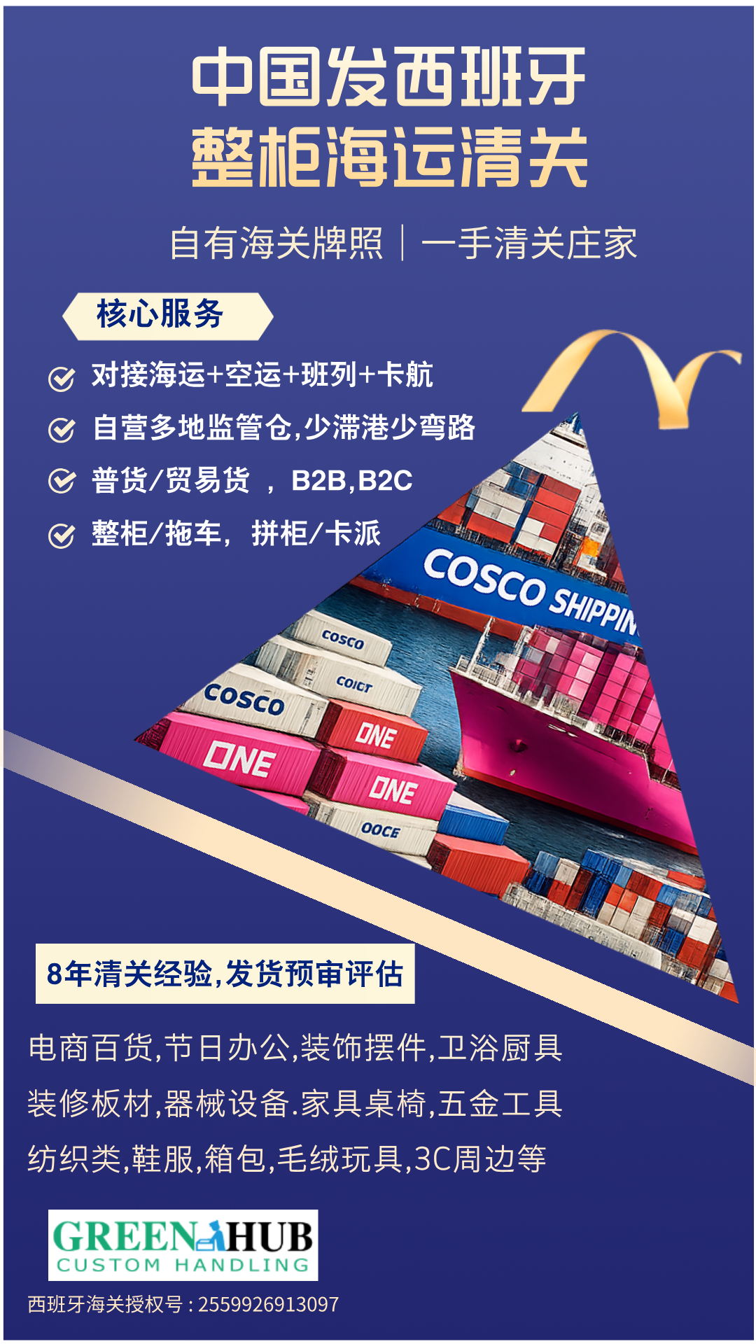 所有单证中列明货物名称、箱数、箱号唛头,重量、体积及HS CODE(需调整归类核实),必须与实际装柜出货情况一致,严谨瞒报,冲货,夹带私货和违禁品等行为,任何不符之处均可能导致清关延误,查验或行政处罚,GHUB报关行,作为西班牙海关持牌授权代理,重大责任事故和违反西班牙海关法律条文的行为,保留追究相关责任和产生额外滞仓费用的权利。