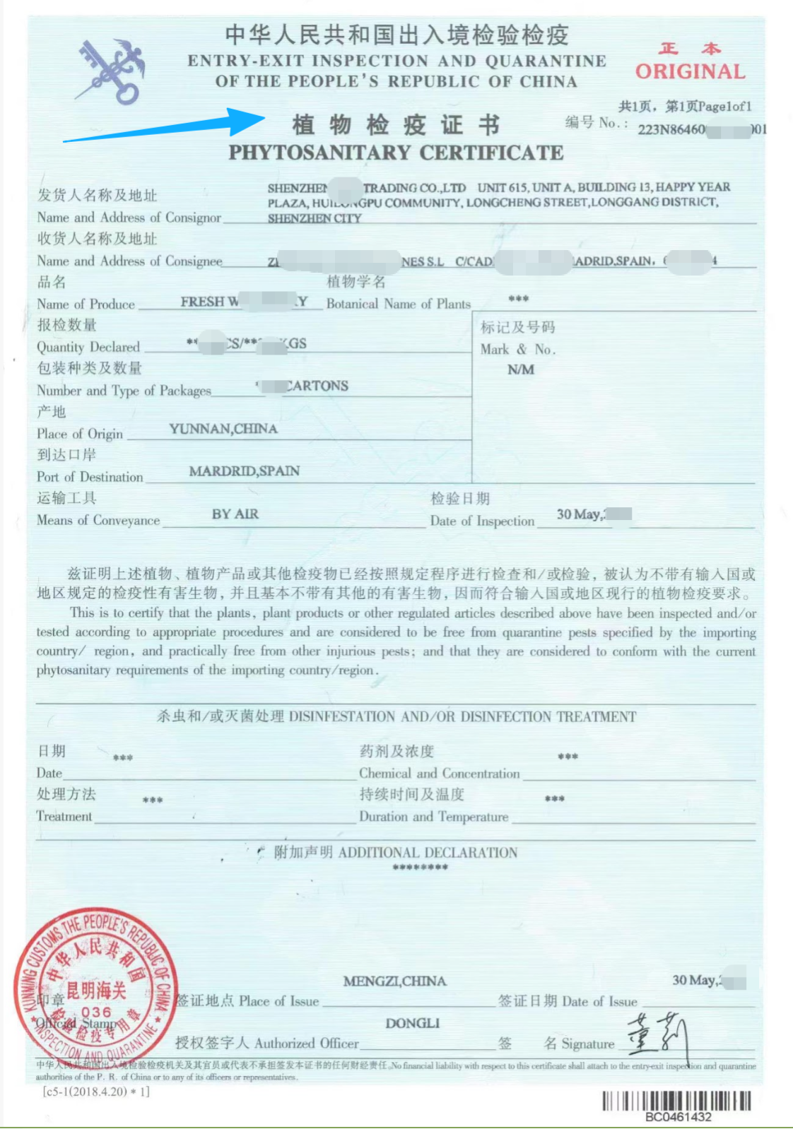 下图展示了我们GHUB报关行测试进口操作的一份真实的植物检疫证书示例(由中国云南海关签发,进口国:西班牙)。